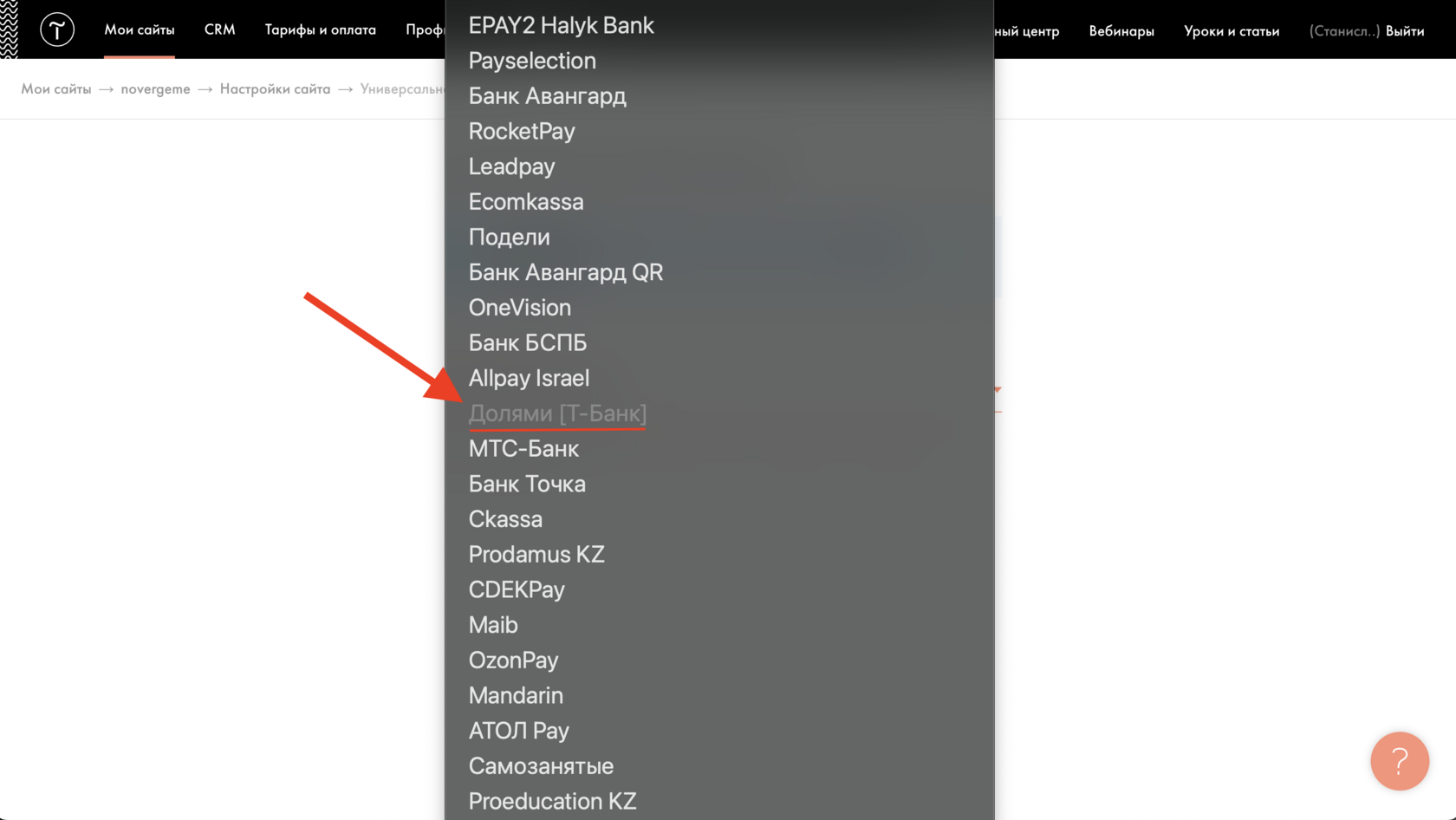 Скриншот: как выглядит «Долями» среди других платежных систем в списке. Техническая настройка в Tilda несложная (копировать/вставить данные), но доступ к системе вы получаете только после одобрения в сервисе Долями: нужно подать заявку, пройти юридические процессы и получить данные для подключения по официальной инструкции.