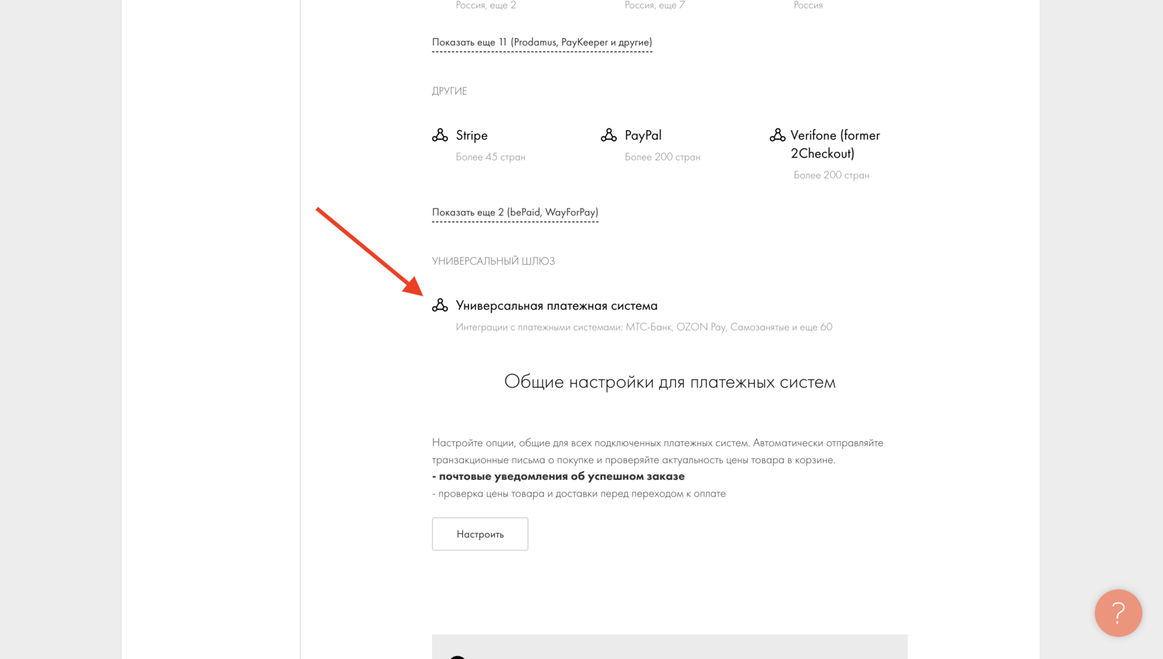 Скриншот: где найти раздел «Универсальная платежная система» в настройках