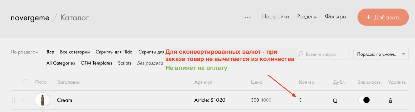 Для основной валюты, установленной в настройках Tilda, и для платежных систем, которые работают с этой валютой, резервирование и списание количества товара продолжают работать корректно.