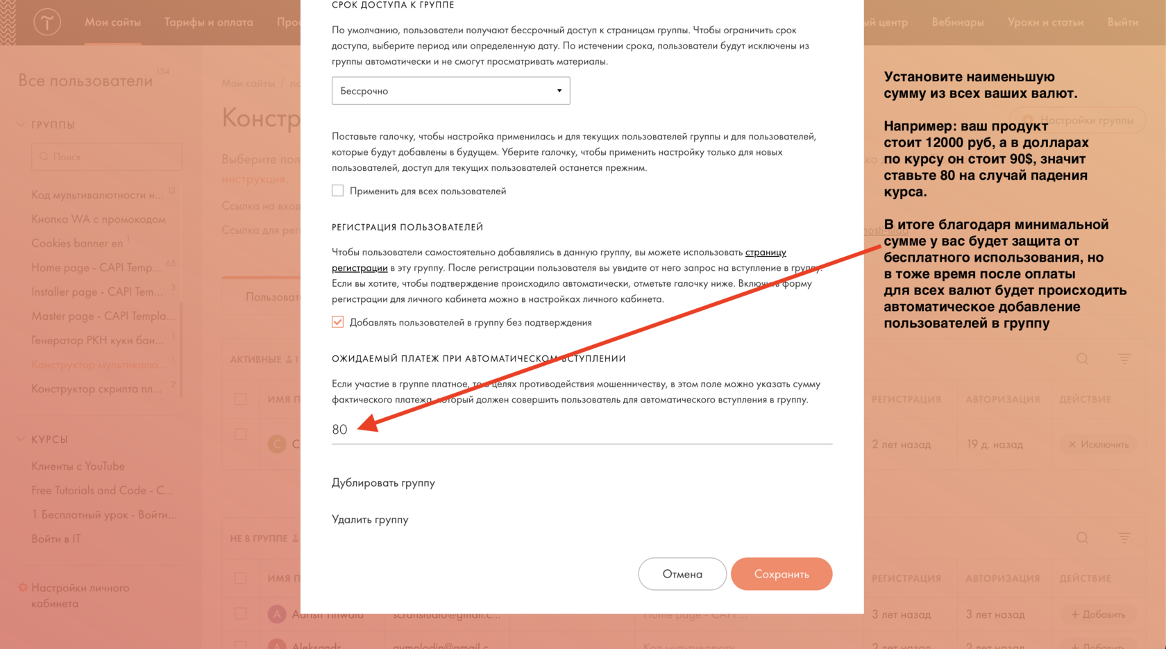 Если после оплаты вы добавляете клиента в группу (доступ к курсам/цифровому продукту), важно правильно задать минимальную сумму для добавления.