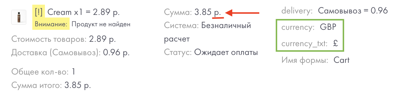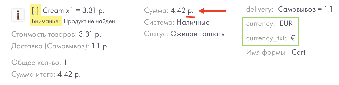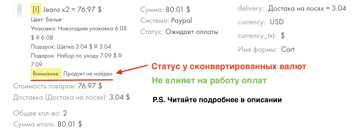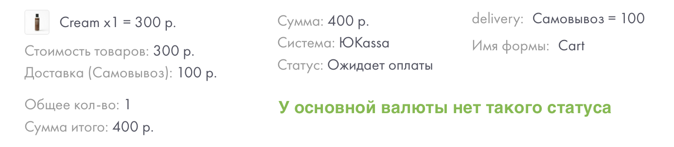 Для ориентира скрипт передает дополнительные параметры currency и currency_txt (код и символ валюты). По ним можно понять, в какой валюте был оформлен заказ.